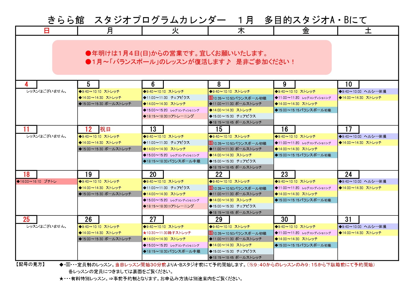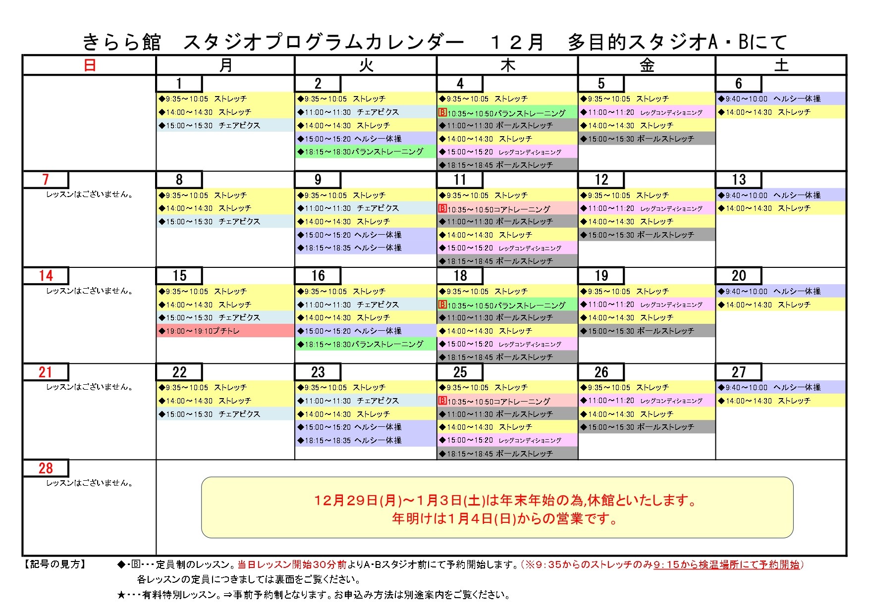 きらら館多目的室(レッスンスタジオ)では、毎日グループエクササイズを行っています。